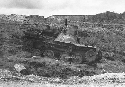 The Japanese were plenty feisty at Finegayan, and in a telling thrust dispatched two medium tanks which skirted the crossroads of the 9th Marines at Junction 177 and went up the Finegayan-Mount Santa Rosa Road. Impervious to Marine fire, the tanks shot up the area and got away. Another tank force of undetermined size then rumbled down under cover of a mortar barrage and it looked like the beginning of a counterattack. Artillery stilled that Japanese effort. The enemy tanks were driven off but survived to reappear again another day.