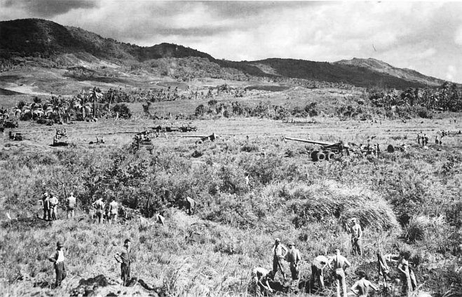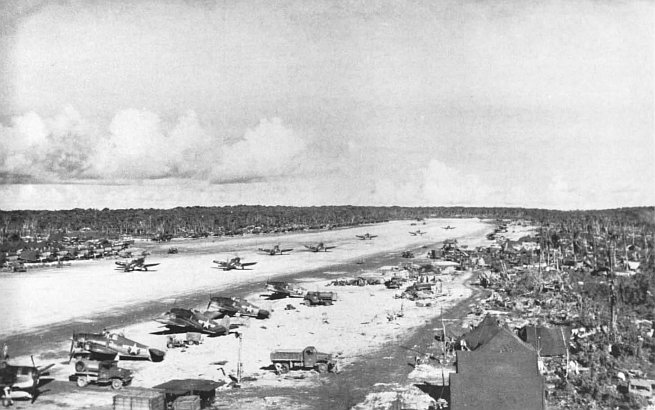 Only six hours after the first bulldozer clanked onto the runways, a Navy torpedo bomber made an emergency landing. Soon the light artillery spotting planes were regularly flying from them.