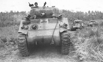 A tank-infantry team from the 4th Marines advances slowly through the dense scrub growth that characterized the terrain in the regiment’s zone on Orote Peninsula. The attack moved forward yard by yard until the objective was secured.