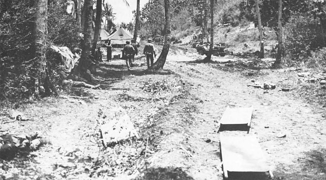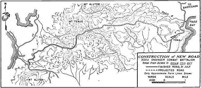 Students of the battle and those who were there consider the taking of the cross-island Agana-Pago Road as a major factor in guaranteeing the success of the drive northward. Its capture solved a host of logistic35 problems, for the 77th particularly. The Army division, for example, had no roads heading north initially in its zone of advance and needed such a road over which it could supply its troops as they came down out of the hills and cut their way through the jungle. Frontline troops in the Army zone were soon running low on supplies, especially water. General Bruce promised his people a hot breakfast as soon as they and the Marines could give him the road. Trucks were soon thick on the road even while SeaBees and engineers were enlarging and repairing it.