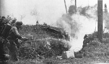 A Marine uses a flamethrower on a Japanese-occupied pillbox on what had been the Marine golf course on Guam, adjoining the Marine Barracks on Orote Peninsula.