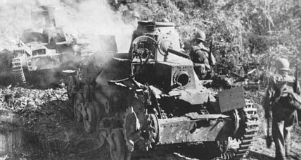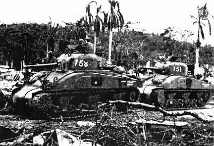 Marines bypass two smoldering Japanese light tanks, knocked out of action by Marine Sherman medium tanks on the road to Sumay on Orote Peninsula.