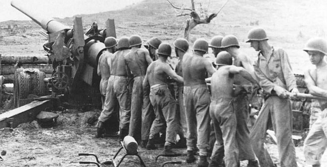 Marine artillerymen, members of Battery C, 7th 155mm (Long Toms) Gun Battalion, III Amphibious Corps Artillery, take advantage of a lull in fire missions to swab the bore of their gun. Soon after, the gun was back in battery firing missions.
