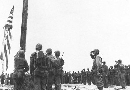 Many of the Marines standing at attention, watching the historic ceremony, could only thank God that they were still alive. At the end of this ceremony, engineers moved onto the airfield to clear away debris and fill the many shell and bomb holes.