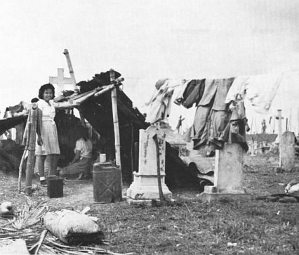 The Catholic cemetery of Anigua became the home of approximately 7,000 Guamanians liberated from Japanese rule. Here a family lives in a temporary shelter.