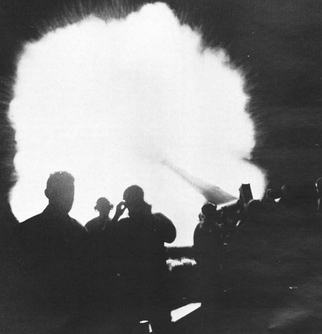 During the night of 2–3 August, U.S. artillery delivered many rounds of harassing and interdiction fire on the enemy in the north of Guam. Here, a blinding flash from a Long Tom lights up the dark Guam night as it joins other guns in the shelling.