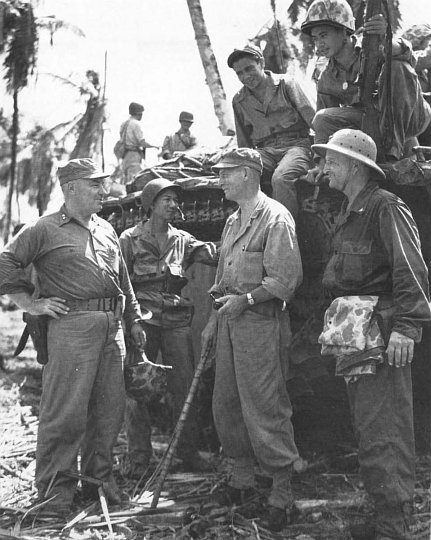 The architects of victory in the Pacific met together on Guam on 10 August 1944, when Indianapolis (CA 35) brought Commandant of the Marine Corps LtGen Alexander A. Vandegrift together with Commander in Chief, Pacific Fleet, Adm Chester W. Nimitz and Fifth Fleet Commander Adm Raymond L. Spruance to the island. From left are MajGen Roy S. Geiger, Commanding General, III Amphibious Corps; Adm Spruance; LtGen Holland M. Smith, Commanding General, Fleet Marine Force, Pacific; Adm Nimitz; and Gen Vandegrift. While together they discussed the future course of the Pacific War.