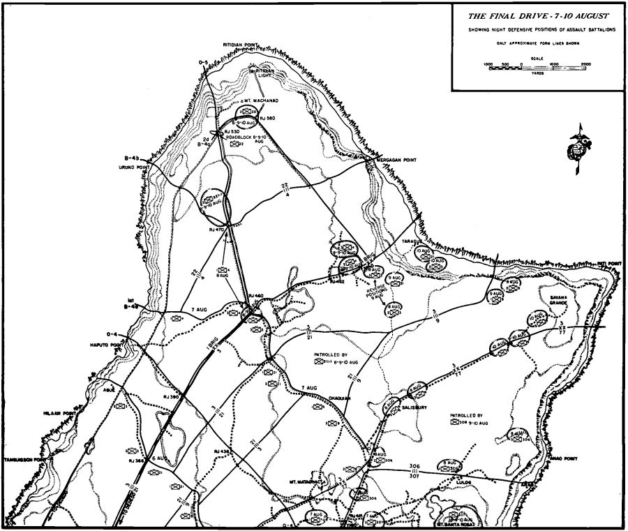 First to be addressed on the way were well-armed outposts like Finegayan and Yigo. Each promised casualties, blood, and delay. General Geiger employed the 77th to reduce Yigo and take Santa Rosa, and left the capture of Finegayan and the rest of northern Guam principally to the 3d Marine Division. He brought up General Shepherd’s brigade to assist in the final drive. To protect the Force Beachhead Line, care for the Guamanians, and hunt down enemy stragglers in the south, General Geiger tasked the 1st Battalion, 22d Marines; the 7th Antiaircraft Artillery Battalion; and the 9th Defense Battalion, all under Lieutenant Colonel Archie E. O’Neil, who commanded the 9th.