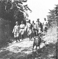 MajGen Henry L. Larsen, left, designated island commander, meets with BGen Lemuel C. Shepherd, Jr., commanding general of the 1st Provisional Marine Brigade, and Col Robert Blake, Gen Larsen’s chief of staff. With them are three Guamanians who enlisted in the Navy before the war and are now visiting their homes.