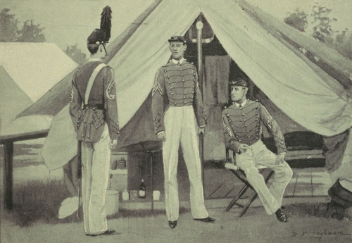 But there was no room for doubt in Benton's case, said the corps. He was soldier in every word and action; stood one of the five—sure; had a rich resonant voice, that was good to hear [271]in the cadet choir and a delight at the entertainment given the fag-end of February—"one hundred days to June." No doubt, the plume and chevrons and sword-knot of the adjutancy would be his; "and no one," said Badger and Coyote, "would better grace or deserve it." On the score of the first captaincy they had less to say, but the battalion said a good deal. No one quite understood why, when Ames was dropped from third to sixth corporal, Wright had not been dropped from second to eighth or even below. He was a fine, tall, dignified fellow, massive of voice and slow of movement, and a very hard student. He was "dad" of the class, but no longer stood in the 5's. He was a fine-looking corporal and would have made an admirable color-bearer, but his impressive dignity was what lifted him so high at the start; and, acting as first sergeant of Company A in their yearling camp under a famous captain, he made no serious failure, but could not compare with either Graham or Connell or Winn as a drill-master. He was made first sergeant of Company A, however, at the outset; and as he was methodical and massive, things looked all right; but it soon became apparent that all manner of "breaks" could happen before his eyes and Wright never see them. More than that, roll-call with him was a very perfunctory affair. Time and again he faced about and reported, "All present, sir!" [272]when one, two, and even, as once happened, six of his company had slept through reveille. Discipline couldn't help running down in Company A; and when recitations in tactics were about half over, it became evident that Wright was nowhere, compared with Graham and Benton, Ames and Connell, and a dozen more of the class.