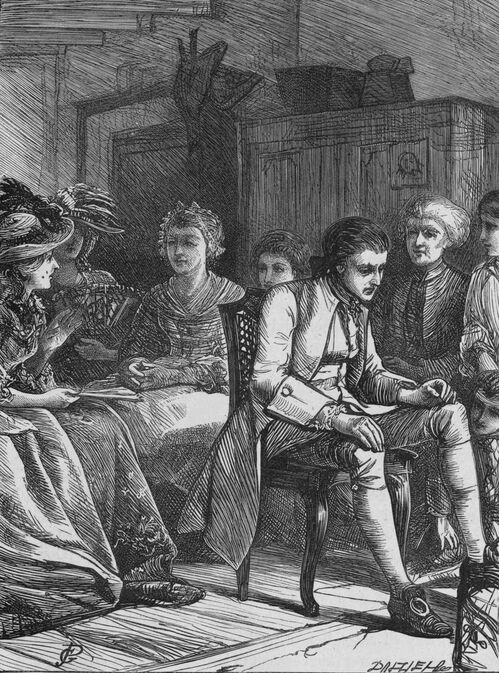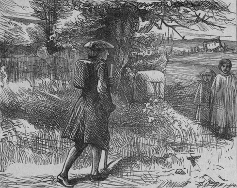 A small triumph, in the shape of an exhibition, worth some thirty shillings, induced the young awkward student to give a very humble kind of ball at his rooms. To this ball came an unexpected visitor in the shape of Wilder the tutor, who put the guests to flight, and publicly beat the host. Smarting under the disgrace, Goldsmith quitted the college, and was only induced, after a time, to return by the persuasions of his brother Henry, who brought about a reconciliation, or rather a truce, between Oliver and his tyrant. On the 27th of February, 1749, he obtained his B.A. degree, and, returning home, remained for a time idle and unemployed, looking out for the chance of a career. He presented himself for ordination and was refused; was a tutor in a private family, and left in consequence of a quarrel; was furnished with funds by Uncle Contarine to study law, lost his money, and appeared again at home destitute. At length, with some last assistance from the friendly uncle's purse, he started on a tour through Europe; travelling, not like the majority of British tourists in coach and on horseback, but on foot and alone, making his way from place to place, and studying men rather than science. Important, and rich in results for his whole future life, was this remarkable journey. And, among the most memorable of its effects was, that it suggested the poem of the "Traveller." Marvellously true were the views taken by the poor student of the various lands through which he passed; and remarkable were the words in which, in one of his early essays, he predicted the change that was coming upon France. Clearly and distinctly he heard the first far-off mutterings of the great revolutionary storm. He saw the growth and spread of the spirit of freedom among the people, and while others cried "peace" when there was no peace, he distinctly and clearly foresaw the great crash of revolution that was coming.