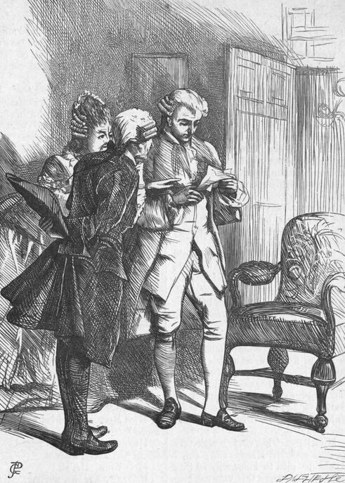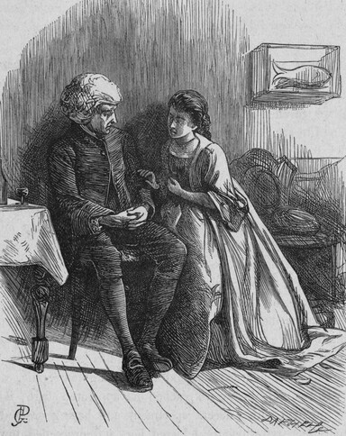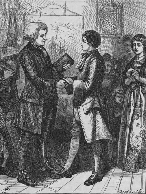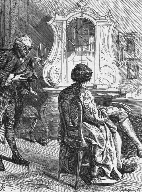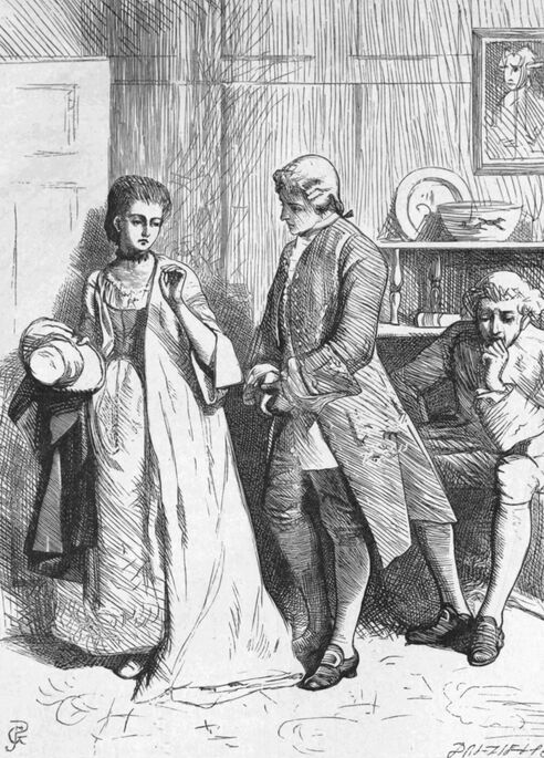 The temper of a woman is generally formed from the turn of her features; at least it was so with my daughters. Olivia wished for many lovers; Sophia to secure one. Olivia was often affected, from too great a desire to please; Sophia even repressed excellence, from her fear to offend. The one entertained me with her vivacity when I was gay, the other with her sense when I was serious. But these qualities were never carried to excess in either, and I have often seen them exchange characters for a whole day together. A suit of mourning has transformed my coquette into a prude, and a new set of ribands has given her younger sister more than natural vivacity. My eldest son, George, was bred at Oxford, as I intended him for one of the learned professions. My second boy, Moses, whom I designed for business, received a sort of miscellaneous education at home. But it is needless to attempt describing the particular characters of young people that had seen but very little of the world. In short, a family likeness prevailed through all; and, properly speaking, they had but one character—that of being all equally generous, credulous, simple, and inoffensive.