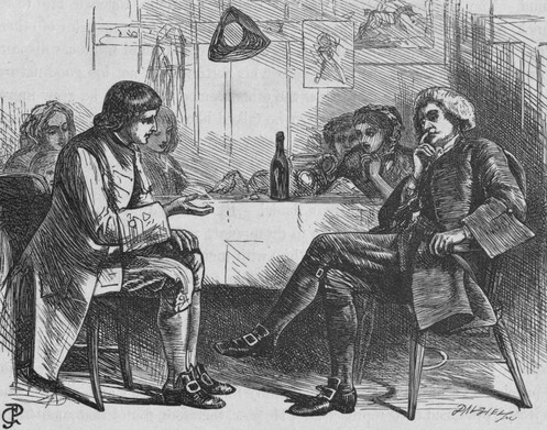 The book thus sold for sixty pounds was the "Vicar of Wakefield," a work never surpassed for wonderful vitality of character and for beauty of colouring. The old vicar, loveable in his very weakness, and indulgent as a Christian priest should be towards the weaknesses of others—the downright honest buxom wife, whose maternal vanity at times tempts her so sorely to disobedience against the behests of her lord and master—Olivia the coquette, and Sophia the prude—Moses the honest and simple—and Burchell with his grand monosyllabic commentary of "Fudge,"—these will live so long as English Literature lasts, and be remembered with delight when the pretentious effusions of the Richardson school have vanished into the limbo of obscurity. But the outcry that has since been raised against the bookseller who only gave sixty pounds for the manuscript appears somewhat unjust. Francis Newbery gave the sum demanded by Johnson, evidently without reading the book, and on Johnson's recommendation alone. That he had no great hopes of profit from his bargain is proved by the length of time he allowed it to lie unpublished in his desk. It was not Newbery's fault that the manuscript was sent out at a pinch, to be sold for what it would bring, before it had even been read to a few discerning friends who might have given a deliberate opinion on its merits. Johnson spoke sensibly enough when he replied to the indignant protest,—" A sufficient price, too, when it was sold; for then the fame of Goldsmith had not been elevated, as it afterwards was, by his 'Traveller;' and the bookseller had faint hopes of profit by his bargain. After the 'Traveller,' to be sure, it was accidentally worth more money."