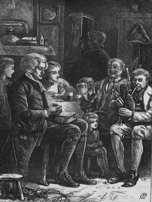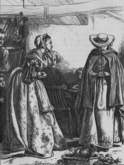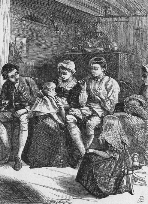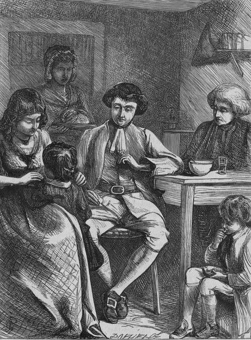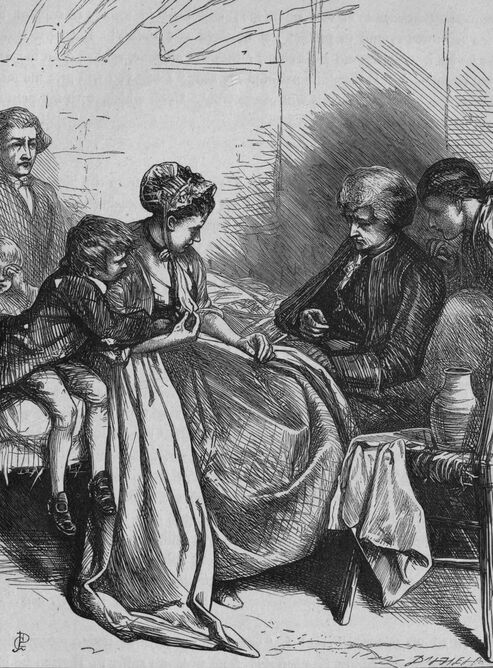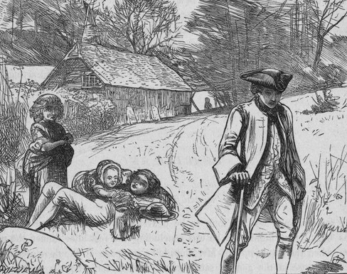 As we lived near the road, we often had the traveller or stranger visit us to taste our gooseberry-wine, for which we had great reputation; and I profess, with the veracity of an historian, that I never knew one of them find fault with it. Our cousins too, even to the fortieth remove, all remembered their affinity, without any help from the heralds' office, and came very frequently to see us. Some of them did us no great honour by these claims of kindred; as we had the blind, the maimed, and the halt amongst the number. However, my wife always insisted that, as they were the same flesh and blood, they should sit with us at the same table: so that if we had not very rich, we generally had very happy friends about us; for this remark will hold good through life, that the poorer the guest the better pleased he ever is with being treated; and as some men gaze with admiration at the colours of a tulip, or the wing of a butterfly, so I was by nature an admirer of happy human faces. However, when any one of our relations was found to be a person of a very bad character, a troublesome guest, or one we desired to get rid of, upon his leaving my house I ever took care to lend him a riding-coat, or a pair of boots, or sometimes a horse of small value, and I always had the satisfaction of finding he never came back to return them. By this the house was cleared of such as we did not like; but never was the family of Wakefield known to turn the traveller or the poor dependent out of doors.