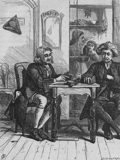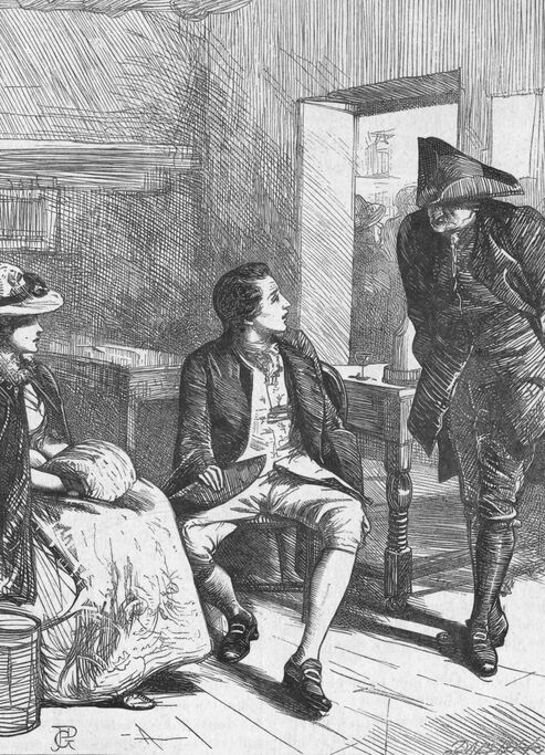 His departure only prepared the way for our own, which arrived a few days afterwards. The leaving a neighbourhood in which we had enjoyed so many hours of tranquillity was not without a tear, which scarcely fortitude itself could suppress. Besides, a journey of seventy miles, to a family that had hitherto never been above ten from home, filled us with apprehension; and the cries of the poor, who followed us for some miles, contributed to increase it. The first day's journey brought us in safety within thirty miles of our future retreat, and we put up for the night at an obscure inn in a village by the way. When we were shown a room, I desired the landlord, in my usual way, to let us have his company, with which he complied, as what he drank would increase the bill next morning. He knew, however, the whole neighbourhood to which I was removing, particularly Squire Thornhill, who was to be my landlord, and who lived within a few miles of the place. This gentleman he described as one who desired to know little more of the world than its pleasures, being particularly remarkable for his attachment to the fair sex. He observed, that no virtue was able to resist his arts and assiduity, and that there was scarcely a farmer's daughter within ten miles round but what had found him successful and faithless. Though this account gave me some pain, it had a very different effect upon my daughters, whose features seemed to brighten with the expectation of an approaching triumph; nor was my wife less pleased and confident of their allurements and virtue. While our thoughts were thus employed, the hostess entered the room to inform her husband that the strange gentleman, who had been two days in the house, wanted money, and could not satisfy them for his reckoning. "Want money!" replied the host, "that must be impossible; for it was no later than yesterday he paid three guineas to our beadle to spare an old broken soldier that was to be whipped through the town for dog-stealing." The hostess, however, still persisting in her first assertion, he was preparing to leave the room, swearing that he would be satisfied one way or another, when I begged the landlord would introduce me to a stranger of so much charity as he described. With this he complied, showing in a gentleman who seemed to be about thirty, dressed in clothes that once were laced. His person was well-formed, and his face marked with the lines of thinking. He had something short and dry in his address, and seemed not to understand ceremony, or to despise it. Upon the landlord's leaving the room, I could not avoid expressing my concern to the stranger at seeing a gentleman in such circumstances, and offered him my purse to satisfy the present demand. "I take it with all my heart, sir," replied he, "and am glad that a late oversight, in giving what money I had about me, has shown me that there are still some men like you. I must, however, previously entreat being informed of the name and residence of my benefactor, in order to repay him as soon as possible." In this I satisfied him fully, not only mentioning my name and late misfortune, but the place to which I was going to remove. "This," cried he, "happens still more luckily than I hoped for, as I am going the same way myself, having been detained here two days by the floods, which I hope, by to-morrow, will be found passable." I testified the pleasure I should have in his company, and my wife and daughters joining in entreaty, he was prevailed upon to stay supper. The stranger's conversation, which was at once pleasing and instructive, induced me to wish for a continuance of it; but it was now high time to retire and take refreshment against the fatigues of the following day.