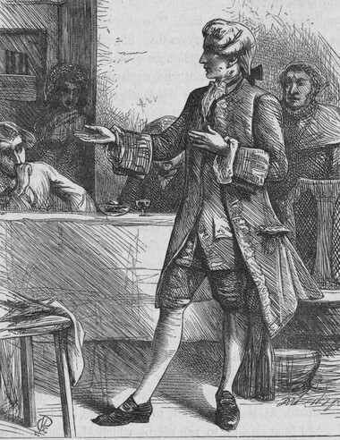 "Well, I was now fairly rid of my military employment. I sold my soldier's clothes, bought worse, and, in order not to be overtaken, took the most unfrequented roads possible. One evening, as I was entering a village, I perceived a man, whom I afterwards found to be the curate of the parish, thrown from his horse in a miry road, and almost smothered in the mud. He desired my assistance: I gave it, and drew him out with some difficulty. He thanked me for my trouble, and was going off; but I followed him home, for I loved always to have a man thank me at his own door. The curate asked a hundred questions; as whose son I was, from whence I came, and whether I would be faithful. I answered him greatly to his satisfaction, and gave myself one of the best characters in the world for sobriety (sir, I have the honour of drinking your health), discretion, and fidelity. To make a long story short, he wanted a servant, and hired me. With him I lived but two months: we did not much like each other. I was fond of eating, and he gave me but little to eat: I loved a pretty girl, and the old woman, my fellow-servant, was ill-natured and ugly. As they endeavoured to starve me between them, I made a pious resolution to prevent their committing murder: I stole the eggs as soon as they were laid: I emptied every unfinished bottle that I could lay my hands on: whatever eatable came in my way was sure to disappear. In short, they found I would not do; so I was discharged one morning, and paid three shillings and sixpence for two months' wages.