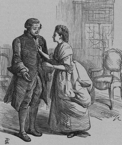 Some months were elapsed in this manner, till at last it was thought convenient to fix a day for the nuptials of the young couple, who seemed earnestly to desire it. During the preparations for the wedding, I need not describe the busy importance of my wife, nor the sly looks of my daughters: in fact my attention was fixed on another object—the completing a tract which I intended shortly to publish in defence of my favourite principle. As I looked upon this as a masterpiece, both for argument and style, I could not in the pride of my heart avoid showing it to my old friend Mr. Wilmot, as I made no doubt of receiving his approbation: but not till too late I discovered that he was violently attached to the contrary opinion, and with good reason; for he was at that time actually courting a fourth wife. This, as may be expected, produced a dispute attended with some acrimony, which threatened to interrupt our intended alliance; but, on the day before that appointed for the ceremony, we agreed to discuss the subject at large.