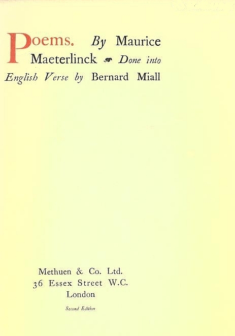 The poems contained in this volume form part of a movement long defunct—the Belgian Symbolist movement, an offshoot of that Belgian renascence which produced so remarkable a body of great and noble poetry. I cannot say, however, that perusal of the other poets of the period will assist the reader to appreciate the volume in hand. Eekhoud, Elskamp, Gilkin, Rodenbach, Verhaeren—none of these wrote verse which could possibly be confounded with that of Maeterlinck; twenty years ago the latter was no less original than he is to-day.