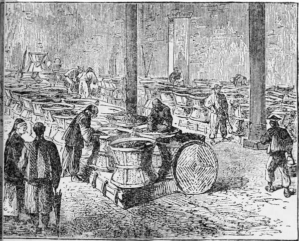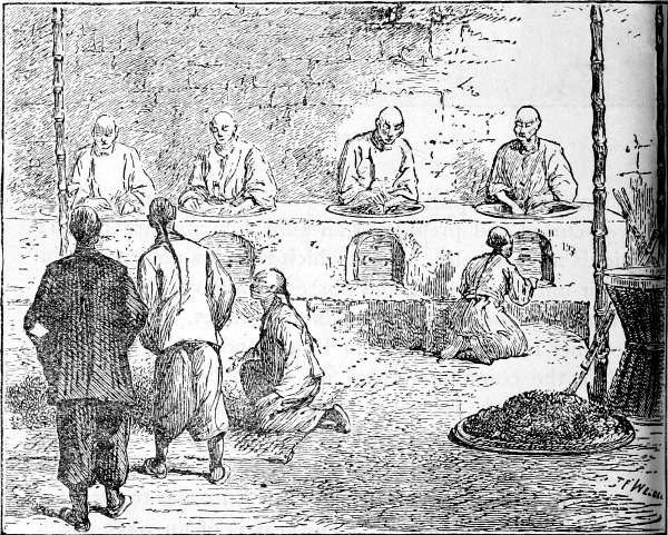 Considerable mystery and confusion for a long time existed regarding the species of plant yielding the varieties known as Green and Black teas, many authorities claiming that the former was produced from the Green tea plant exclusively, and the latter from the Black tea plant solely, while again it was held by others that both varieties were prepared at pleasure from but one and the same species, the mere difference in color, flavor and effects being due entirely to a disparity in the soil and process of curing. But later and more careful investigation disprove these particular opinions, as while it is now admitted, even by the Chinese themselves, that both kinds may be produced at will from either or both species of the tea plant, it is a popular error to imagine that China produces the two commercial kinds in all districts, as the preparation of the greater proportion of the respective varieties is carried on in widely separated districts of the Empire from corresponding species of the tea plant, different methods being adopted only in the process of curing the two kinds from the first stage. Green teas are prepared and distinguished from Black in such instances by the fact that the former are not fermented as long or fired as high in the process of rolling as the latter. It was also a commonly-received opinion at one time that the distinctive color of Green teas was imparted to them by being cured and fired in copper pans. For this belief, however, there is not the slightest foundation in fact, as copper pans are never used for the purpose of firing tea, repeated experiments and unerring tests having been frequently made by competent experts, but not even in a single instance has any trace of that metal been found in them.