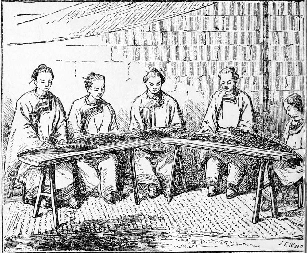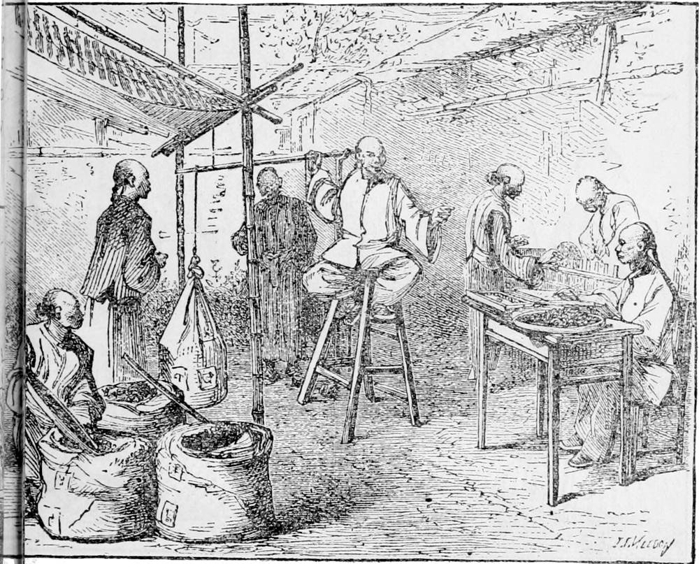 What are known as “Canton” and “Country” Green Teas are also spurious Teas, the former being manufactured from spent or exhausted Tea leaves, that is Tea once used, dried, refired and colored with gypsum or Prussian blue. The latter being prepared from the leaves of wild or uncultivated Tea plants.