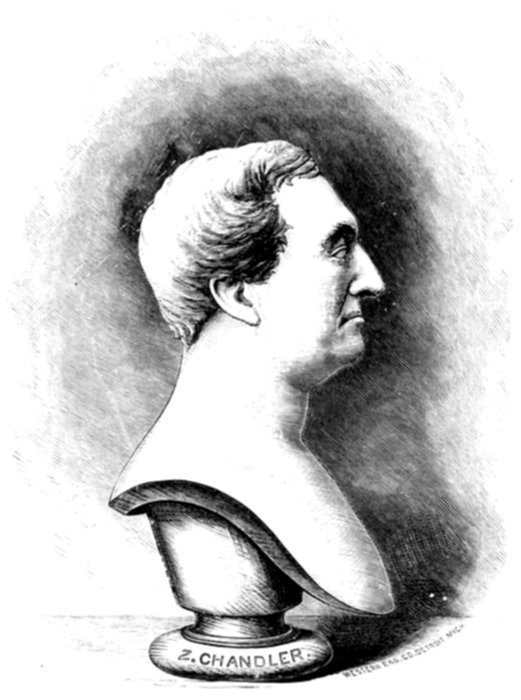 Zachariah Chandler had nearly completed his sixty-sixth year; forty-six years he had been a resident of the City of the Straits. New Hampshire was the State of his nativity: Michigan was, in an emphatic sense, the State of his adoption. In our city his first success was won in mercantile pursuits, where also was the first field for the exhibition of his energy, ability and integrity. Here, as this century passed its meridian hour, he passed the great turning-point in his career; and his large capacities and energies were diverted into a political channel. First, Mayor of the city, then nominated for Governor; when, more than twenty years ago, a successor was sought for Lewis Cass in the Senate, this already marked man became the first representative of the Republican party of this State in that august body at Washington. There, for a period of eighteen years, he sat among the mightiest men of the nation, steadily moving toward the acknowledged leadership of his party, and the inevitable command of public affairs. After three terms in the Senate, his seat was occupied for a short time by another; but, upon the resignation of Mr. Christiancy, he was, with no little enthusiasm, re-elected, and was in the midst of a fourth term, when suddenly he was no more numbered among the living. It may be doubled whether, at this time, any one man, from Maine to Mexico, swayed the popular mind and will with a more potent sceptre than did he; and many confidently believe and affirm that, had death spared him, he would have been lifted by the omnipotent voice and vote of the people to the Presidency of the Republic.