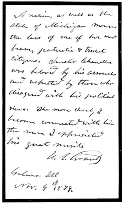 "A nation, as well as the State of Michigan, mourns the loss of one of her most brave, patriotic and truest citizens. Senator Chandler was beloved by his associates and respected by those who disagreed with his political views. The more closely I became connected with him the more I appreciated his great merits.