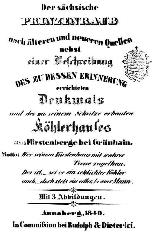Kunz, der durch das Stürmen wohl wußte, daß es ihm galt, glaubte dennoch sicher zu sein, da er bereits selbst bei Waschleute glücklich vorbei geritten, also dem ersten Ziele ganz nahe, nur etwa ¾ Stunde noch von Schwarzenberg entfernt war, ließ also den jungen Prinz Albrecht absteigen, um[23] Waldbeere pflücken zu dürfen.[31] Auch Kunz stieg ab und suchte dem Prinzen Albrecht Waldbeere, indem er sein Pferd am Zügel hielt. Indessen Kunz immer tiefer in dem Walde Waldbeere suchte, nährten sie sich einem Köhler, Namens Georg Schmidt, der mit seinem Hunde sein Mittagsbrod theilte.