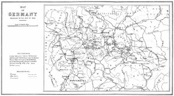 As the advocate of the admission of Schleswig-Holstein as a sovereign state in the Germanic Confederation, Austria gained first the sympathy, and then the active alliance, of Bavaria, Hanover, Saxony, Hesse-Cassel, Würtemberg, Baden, Hesse-Darmstadt and Nassau. Prussia aimed at the incorporation of the duchies within her[6] own territory; and, though loudly championing the cause of German unity, her course was so manifestly inspired by designs for her own aggrandizement, that she could count on the support of only a few petty duchies, whose aggregate military strength did not exceed 28,000 men. As an offset to Austria’s formidable German allies, Prussia had concluded an offensive and defensive alliance with Italy, whose army, though new and inferior in organization, armament and equipment, to that of her antagonist, might be relied upon to “contain” at least three Austrian army corps in Venetia. The main struggle was certain to be between the two great Germanic nations.