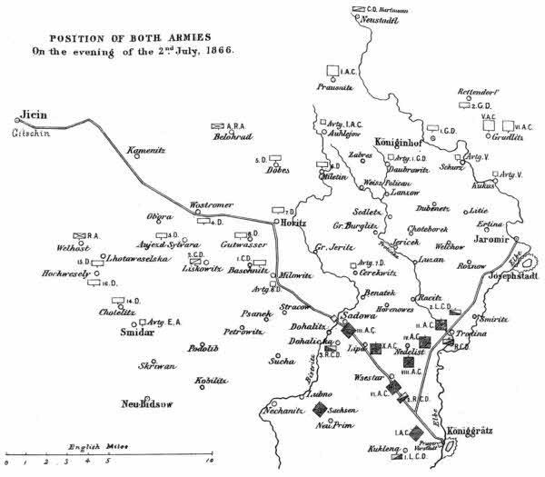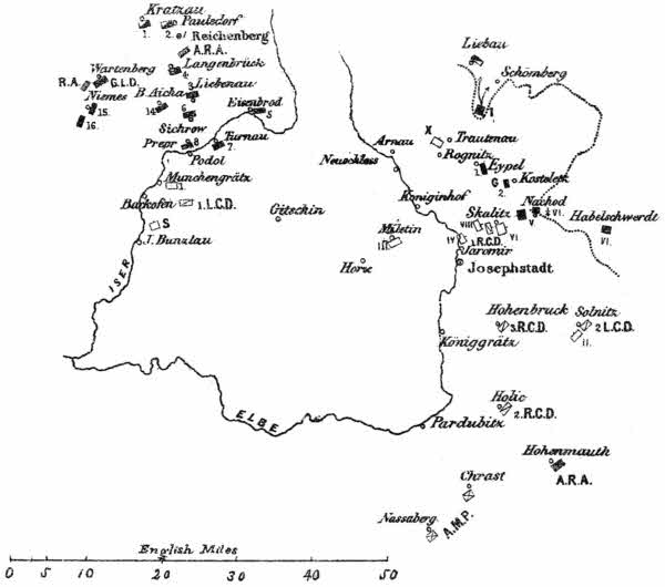 [7] It should be remembered that, in addition to the four corps immediately opposed to the Crown Prince, the IIId and IId Austrian Corps were at Von Benedek’s disposal; the latter being scarcely more than two marches distant from Josephstadt.