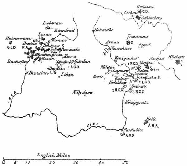 [10] Gitschin, Jung Buntzlau, and Libau are shown on Map No. 6. The positions of the other places here mentioned are, in reference to Gitschin, as follows: Aulibitz, nearly 4 miles east; Chotec, about 7 1/2 miles east; Konetzchlum, about 6 1/2 miles east-south-east; Milicowes, about 4 1/2 miles south-south-east; Podhrad, about 2 miles south-west; Robaus, about 2 miles east; Dworetz, near, and north of, Robaus.