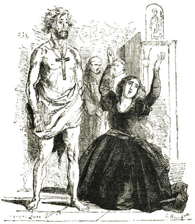 Enfin, comme elle trembloit d’impatience et d’horreur, elle vit tout-à-coup s’avancer gravement un homme presque entièrement nu, d’une maigreur excessive. Entre ses cheveux touffus et sa barbe, deux grands yeux fixes étinceloient. Un crucifix[304] d’ébène et d’argent étoit suspendu sur sa poitrine.