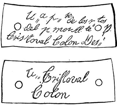 [vi] Illustrations: Fac-simile of first page of Columbus’ Letter, No. III., 49; Cut on reverse of Title of Nos. V. and VI., 50; Title of No. VI., 51; The Landing of Columbus, 52; Cut in German Translation of the First Letter, 53; Text of the German Translation, 54; the Bahama Group (map), 55; Sign-manuals of Ferdinand and Isabella, 56; Sebastian Brant, 59; Map of Columbus’ Four Voyages, 60, 61; Fac-simile of page in the Glustiniani Psalter, 63; Ferdinand Columbus’ Register of Books, 65; Autograph of Humboldt, 68; Paulus Jovius, 70. Portraits of Columbus,—after Giovio, 71; the Yanez Portrait, 72; after Capriolo, 73; the Florence picture, 74; the De Bry Picture, 75; the Jomard Likeness, 76; the Havana Medallion, 77; Picture at Madrid, 78; after Montanus, 79; Coffer and Bones found in Santo Domingo, 80; Inscriptions on and in the Coffer, 81, 82; Portrait and Sign-manual of Ferdinand of Spain, 85; Bartholomew Columbus, 86. | |