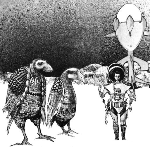He had found the planet of Lorrane easily. The adventurer's charts were accurate. It was a dry, barren place, an old, worn-out world where only wind and sand moved, where mountains shoved their eroded peaks into the impotent sky. But Ingomar found, upon emerging from his ship, that there was another movement. Two black dots appeared far away in the sky and rapidly grew larger. He had been told that the planet was populated by an intelligent form of bird life. Two were approaching now.