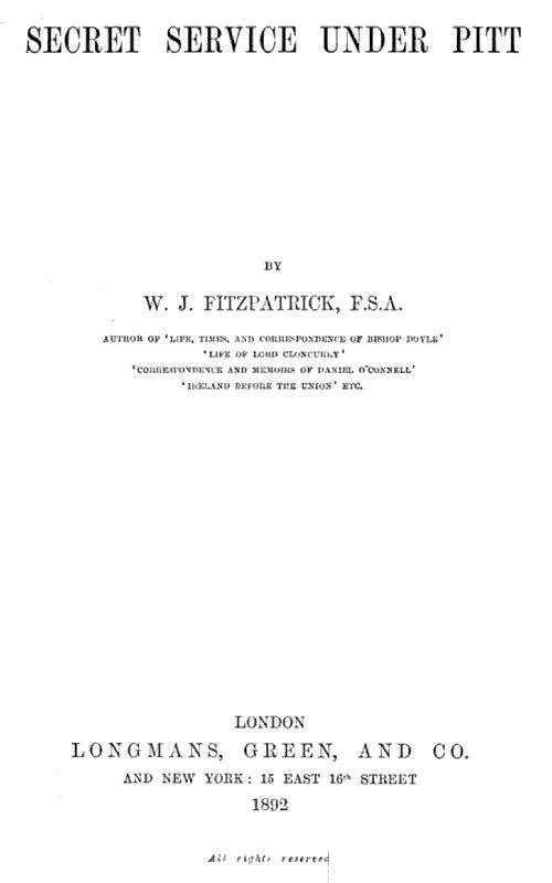 These rough notes—begun long ago and continued at slow intervals—were put aside during the onerous task of editing for Mr. Murray the O'Connell Correspondence. The recent publication of Mr. Lecky's final volumes, awakening by their grasp a fixed interest in pre-Union times, and confirming much that by circumstantial evidence I had sought to establish, affords a reason, perhaps, that my later researches in the same field ought not to be wholly lost. Mr. Lecky's kindness in frequently quoting me[1] merits grateful acknowledgment, not less than his recognition of some things that I brought to light as explanatory of points to which the State Papers afford no clue. This and other circumstances encourage me in offering more.