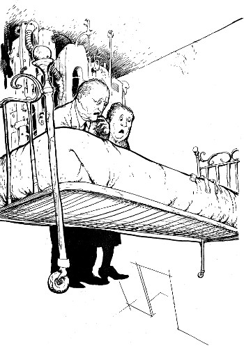 Well, Mr. Gretch, it was so pitiful, I can't describe it. He was there, but I never saw a more miserable human being. He was not only thin but also flat, like a cartoon of a man who had been steamrollered. He was lying on the bed, holding onto the covers, with no more substance to him than a thin piece of paper. Less.