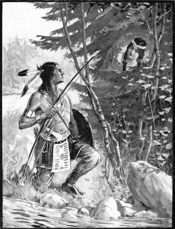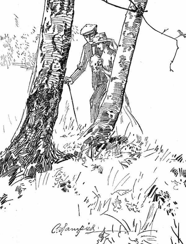 The path down through the trees was green-mossed, winding, and steep. I went swiftly but noiselessly. Near the foot, as I was just about to emerge upon the beach, the sound of voices below caught my ear. I essayed to stop myself, slipped, crashed through a brittle screen of dead spruce boughs, and came down, erect upon my feet but somewhat jarred, not ten paces from the spot where a lady and a cavalier, locked in one another’s arms, stood beside a small boat drawn up upon the shingle.