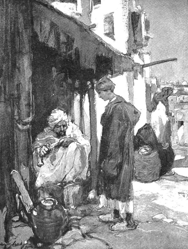 Dimoussi had not so much as a copper flouss upon him, but, on the other hand, he had a pistol and the whole world in front of him. And what reasonable 4boy could want more? All that day he wandered about the streets, gaping at the houses, at the towers of the mosques, and at the stalls in the markets, but as the afternoon declined, hunger got hold of him. His friends of yesterday had vanished. Somehow he must get food.