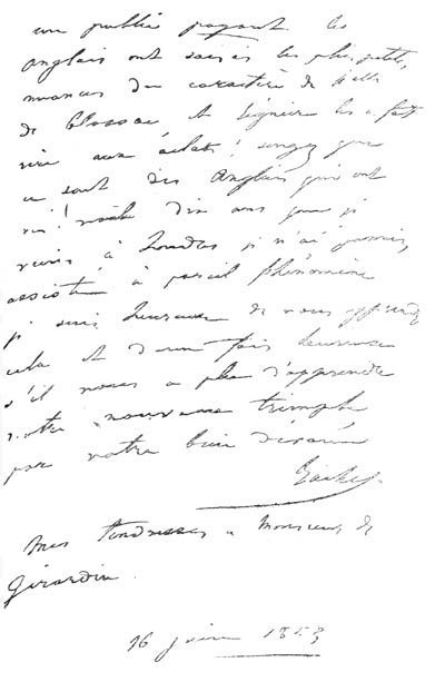 «Ma sœur m'a appris, et j'en suis ravi, que vous allez publier en volumes vos anciens feuilletons—ne m'oubliez pas, lors de l'apparition du livre—j'y compte pour mes longues soirées d'hiver—je retrouverai là tant et tant de souvenirs!... Je reverrai ainsi le monde que vous peigniez avec tant de grâce, de finesse et de profondeur, et où nous nous rencontrions si souvent—de grâce encore, ne m'oubliez pas, les soirées passées avec vous dans ma solitude me seront si précieuses!... Adieu, adieu, je suis horriblement triste, ma sœur part dans deux heures, et ma pauvre petite maison va me paraître bien grande et bien vide... Mille choses de ma part à Emile. Si vous avez un moment à perdre, un mot, et vous me rendrez bien heureux. Encore adieu à tous et bien à vous.» (Lettre inédite).