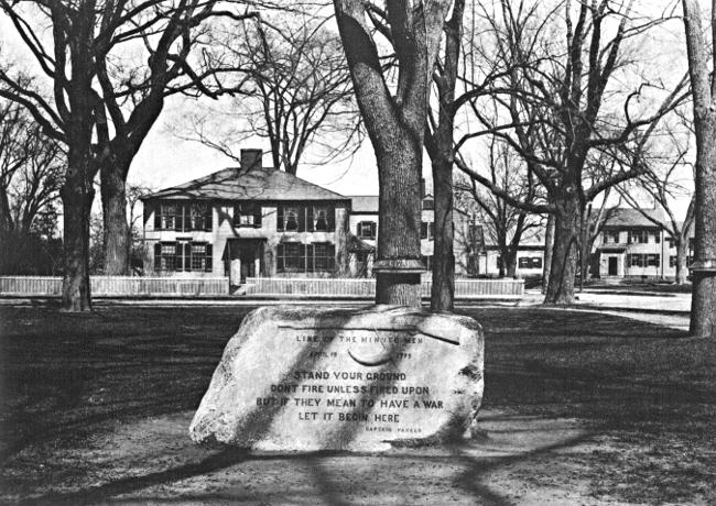 During the years immediately preceding the conflict on Lexington Green, the temper of the Colonials was sorely tested by persecutions instigated by Tyrant George III—“the Stamp Act, its repeal, with the declaration of the right to tax America; the landing of troops in Boston, beneath the batteries of fourteen vessels of war, lying broadside to the town, with springs on their cables, their guns loaded, and matches smoking; the repeated insults, and finally the massacre of the fifth of March resulting from this military occupation; and the Boston Port Bill, by which the final catastrophe was hurried on.” Delegates were appointed to the Continental Congress; at Salem the Provincial Congress was formed in October, 1774. At Concord and Cambridge the latter assembly enacted measures providing for troops, officers and stores. Early in the year 1775 it was clear that the crisis was at hand. General Gage betrayed his intentions when in March he caused the stone walls to be leveled that divided the fields about Boston, and so made these peaceful pastures ready for battle. His spies obtained information as to the amount of provisions hoarded at Concord and Worcester. On the fifteenth of April patriots in Boston were convinced that the plans of the British were mature, and an attack on Concord was imminent. By advice of Hancock and “Sam” Adams the stores were distributed among neighboring towns. Colonel Revere delivered his first warning, and “at length the momentous hour arrived, as big with consequences to Man as any that ever struck in his history.”