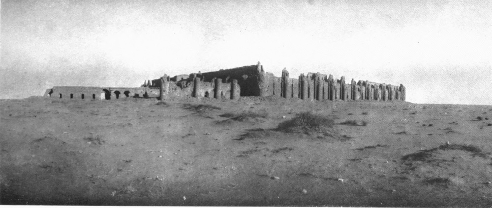 The palace of Ukhaiḍir was practically unknown until the winter of 1908-9, although it had been seen by European travellers as early as the seventeenth{ix} century. Della Valle passed by it in June 1625 on his way from Baṣrah to Aleppo, and described it as ‘a great ancient fabric, perfectly square, with thirteen pilasters or round columns on each side without, and other compartments of arches; within which were many chambers, with a court of no great bigness and uncovered. The Arabians call this fabric Casr Chaider. I could not conjecture whether it had been a palace or temple or castle; but I incline to believe it a palace rather than anything else.’[1] Pedro Teixeira’s account is doubtful. He says:[2] ‘At eleven in the morning we came to a dry channel which in winter they say has much water, and I thought it likely by the nature of its situation and capaciousness. Over it, on a rising ground, is still an ancient square fort, with twelve bastions, three on each side, made of burnt brick and lime, strong and well built. Without it, at about sixty paces distance, is a small Alcoran, or Tower, ten cubits high, tho’ it appears to have been higher, of the same structure, all decay’d with age; yet it appears to be a royal fabrick by its goodness and the place it stands in, where it could not be raised without mighty cost and much labour, and difficulty. It was done by an Arabian king, grandfather to Xeque Mahamed Eben Raxet, whom I said before I was carried to see, to secure the caravans going that way before the Turks possess’d themselves of Bagdat and Bazora. The Arabs call it Alcayzar or Kayzar, which signifies a palace or Cesar’s House, for so they call all that belong to kings and princes. This they reckon the half-way from Bazora to Mexat Aly, whither we were going. We found some small wells in this channel, the water of them clear and fresh, but of an intolerable ill scent, yet necessity prevail’d.’ The only item in this description which connects Teixeira’s palace with Ukhaiḍir is the name. Teixeira reached Meshhed ‘Ali (Nedjef) six days after he had passed by Alcayzar and he gives the situation of the palace as half-way between Baṣrah and Nedjef, whereas Ukhaiḍir lies to the north-west of Nedjef. There is no ‘Alcoran’, i.e. minaret, at Ukhaiḍir, neither could the building be described, even by the least careful observer, as a square fort with three bastions on each side. I am therefore inclined to suppose that there is another ruin called Ukhaiḍir further to the south. We need not linger over the derivation which he assigns to the name.