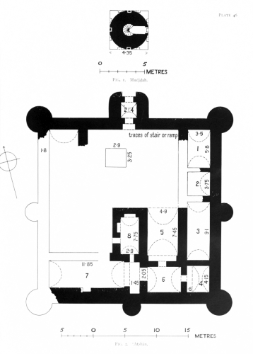 In the present study my eyes have been turned chiefly, and necessarily, backwards. I have not been so much concerned with the offspring as with the parentage of the buildings which I have passed under review. Of these buildings the most important is the great palace of Ukhaiḍir on the eastern side of the Syrian desert. I have given, also, the first plans and photographs of three small ruins in its vicinity, Qṣair, Mudjḍah, and ‘Aṭshân. If they do not belong to the same period as the palace, they cannot be far removed from it in date. The problems presented by Ukhaiḍir led me back to Sasanian architecture, and I publish here new plans and photographs of two vast constructions at Qaṣr-i-Shîrîn. I have, further, taken this occasion to publish the plans of two mosques, the one at Diyârbekr, the other at Mayâfârqîn, both of which belong to a later period. The first of these has been known to us only through a sketch made by Texier, which I found to be inaccurate in many significant points, as it is also incomplete. The second has not previously been studied.
