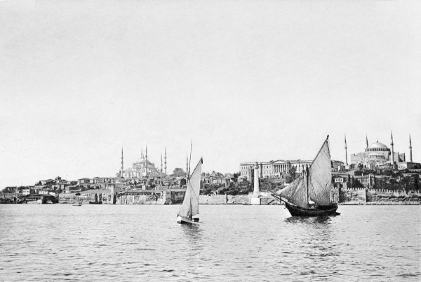 20 It was a white peak, the summit of some very high minaret whose base remained as yet completely hidden. Immediately every glass was levelled at it, and every eye began to burrow in that little rent in the haze as though trying to make it larger. The ship was now steaming rapidly ahead. In a few minutes an uncertain shape was visible beside the minaret, then another, then two, then three, then many more, which, stretching out in an endless line, gradually assumed the appearance of houses. On the right and ahead of us everything was still concealed by the fog. That which was now coming into view was the part of Stambul which extends like the arc of a circle for about three miles, from Cape Seraglio along the northern shore of the Sea of Marmora to the Castle of the Seven Towers; but the Seraglio hill was still invisible. Beyond the houses, one after another, the minarets now flashed into sight, white, lofty, their peaks touched with rose color by the rising sun. Below the houses we could begin to distinguish the dark line of the ancient walls, uneven and tortuous, strengthened at regular intervals by massive towers, their foundations partially washed by the sea-waves, and encircling the entire city. Before long fully two miles of the city lay before us in full view, but, to tell the truth, the sight fell decidedly short of my expectations. It was just here that Lamartine asked himself, “Can this be Constantinople?” and cried, “What a disappointment!”21 The hills being still hidden, nothing was to be seen but interminable lines of houses along the shore, and the city was apparently perfectly flat. “Captain,” I too cried, “is this Constantinople?” The captain seized me by the arm and pointed ahead. “O man of little faith!” said he, “look there!” I looked, and an exclamation of amazement escaped me. A shadowy form, vast, impalpable, towering heavenward from a lofty eminence, rose before us, its graceful outlines still partially obscured by a filmy cloud of vapor, and surrounding it four tall and graceful minarets whose peaks shone like silver as they caught the first rays of the morning sun. “St. Sophia!” cried a sailor, and one of the Athenian ladies murmured in an undertone, “Hagia Sofia!” (Holy Wisdom). The Turks in the bow at once rose to their feet. And now before and around the great basilica were discernible through the fog other vast domes and minarets crowded close together like a forest of gigantic branchless palms. “The mosque of Sultan Ahmed!” cried the captain, pointing; “the Bayezid mosque, the mosque of Osman, the Laleli mosque, the Suleimaniyeh!”