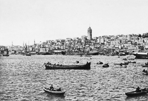 And, true enough, there did at last begin to appear through the mist first little specks of white, then the vague outlines of a lofty eminence, then scattered beams of light where some window caught and reflected the sun’s rays, and finally Galata and Pera stood revealed before us—a mountain, a myriad of houses, of all colors, heaped one above another, a lofty city crowned with minarets, domes, and cypress trees, and towering over all the monumental palaces of the foreign ambassadors and the great tower of Galata; beneath, the vast arsenal of Top-Khâneh and a forest of shipping; and still, as the fog lifted, more and more of the city came into view stretching along the banks of the Bosphorus; and in bewildering succession there leaped into sight streets and suburbs extending from the hilltops to the water’s edge, closely built, interminable, marked here and there with the sparkling white tips of the mosques—line upon line of buildings, little bays, palaces built upon the shore, pavilions, kiosks, gardens, groves; and, dimly outlined through the distant haze, other suburbs still, their roofs alone distinguishable, all gilded by the sun’s rays—a luxuriance of color, a profusion of verdure, a succession of vistas, a grandeur, a grace, a glory sufficient to27 make any one break forth into transports of incoherent delight. Every one on board, however, stood speechless, staring, with mouth and eyes wide open—passengers, seamen, Turks, Europeans, children. Not a whisper was heard. No one knew in which direction to look. On one side lay Skutari and Kadi Keui; on the other, the Seraglio hill; opposite, Galata, Pera, and the Bosphorus. To see it all one had to keep revolving around in a circle like a teetotum, and revolve we did, devouring with our eyes first this and then that, gesticulating, laughing, but speechless with admiration. Heavens above! what moments in a man’s life!