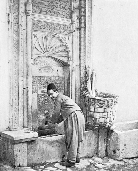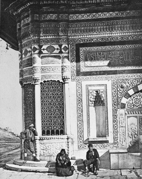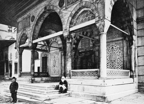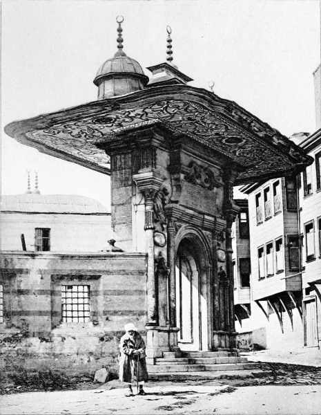 The mosque of St. Sophia stands opposite the main entrance of the old Seraglio. On reaching, however, the open square which lies between the two, the first object to attract attention is, not the mosque, but the famous fountain of Sultan Ahmed III., one of the richest and most characteristic examples252 of Turkish art. This exquisite little building is not so much a monument as a caress in marble imprinted in a moment of passionate adoration by an enamored sultan upon the forehead of his beloved Stambul. I doubt if any but a woman’s pen can do it justice: mine, I feel convinced, is far too coarse and heavy to trace those delicate outlines. At first sight it hardly looks like a fountain at all, being in the form of a little square temple with a Chinese roof, whose undulating rim extends for some distance beyond the walls, and lends to the whole something of the character of a pagoda. At each corner rises a round tower furnished with small screened windows, or, rather, they are more like four charming kiosks, corresponding to the graceful cupolas on the roof which encircle the main central cupola. In each of the four walls are two niches, flanking a pointed arch, beneath which the water flows from a spout into a small basin. Around the edifice there runs an inscription which reads as follows: “This fountain speaks to you in the following verse by Sultan Ahmed: Turn the key of this pure and tranquil spring and call upon the name of God; drink of these inexhaustible and limpid waters and pray for the Sultan.” The little building is composed entirely of white marble, which, however, is almost hidden beneath the mass of ornamentation with which its walls are covered—arches, niches, tiny columns, roses, polygons, garlands, fretwork, gilding253 on a background of blue. Carving around the cupolas, inlaid-work below the roof, mosaics of a hundred different combinations of color, arabesques of every conceivable form,—all seem to vie with one another to attract attention and arouse admiration, until one’s powers of seeing and admiring are well-nigh exhausted. Not so much as a hand’s breadth of space is left free from carving, painting, gilding, or ornament of some sort. It is a prodigy of richness, beauty, and patience, which should, by rights, be preserved under a glass case; and, as though it were too perfect to delight but one sense alone, you are tempted to break off a piece and put it in your mouth, feeling that it must taste good as well—a casket designed, as one would suppose, to guard some priceless treasure, and you long to open it and find the—what? Infant goddess, magic ring, or fabulous pearl. Time has to some extent faded the brilliant colors, dimmed the gilding, and darkened the marble; think, then, what this colossal jewel must have been when first unveiled, all fresh and sparkling, before the eyes of the Solomon of the Bosphorus a hundred and sixty years ago! But, old and faded as it is, it undoubtedly occupies the first place among the lesser wonders of Constantinople, and is, moreover, an object so distinctively Turkish that, once seen, it claims a prominent position among that certain number of others which will dwell for ever in one’s memory, ready to rise up at254 the sound of the word “Stambul;” the background for all time against which will be thrown out one’s dreams and visions of the Orient.