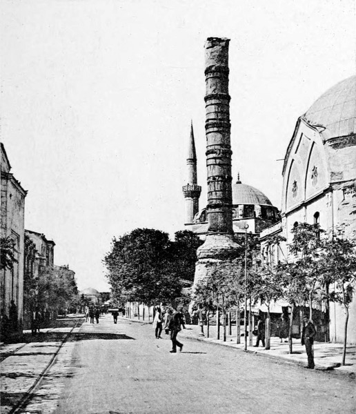 On the Bosphorus, beneath the Seraglio walls and just opposite Leander’s Tower, which rises from the water like a lover’s monument, you may still behold the inclined plane down which the bodies of the unfaithful beauties of the harem were rolled into the167 sea; in the middle of the Et-Meidan the serpentine column still bears witness to the force of Muhammad the Conqueror’s famous sabre; on the Mahmûd bridge the spot is still pointed out on which the fiery sultan annihilated at a single blow the adventurous dervish who had dared to fling an anathema in his face; in the Holy Well of the Balukli church the miraculous fish still swim about which foretold the fall of the City of the Palæologi; beneath the trees of the Sweet Waters of Asia you can visit those shady retreats where a dissolute sultana was wont to bestow upon the favorite of the hour that fatal love whose certain sequence was death. Every doorway, every tower, every mosque and park and open square, records some strange event—a tragedy, a love-story, a mystery, the absolutism of a padishah or the reckless caprice of a sultana; everything has a history of its own, and wherever you turn the near-by objects, the distant view, the balmy perfumed air, the silence, all unite to transport him whose mind is stored with these histories of the past out of himself, his era, and the city of to-day, so that not infrequently, when suddenly confronted with the suggestion that it is high time to think of returning to the hotel, he asks himself confusedly what it means, how can there be a “hotel.”