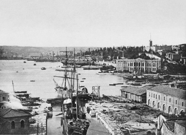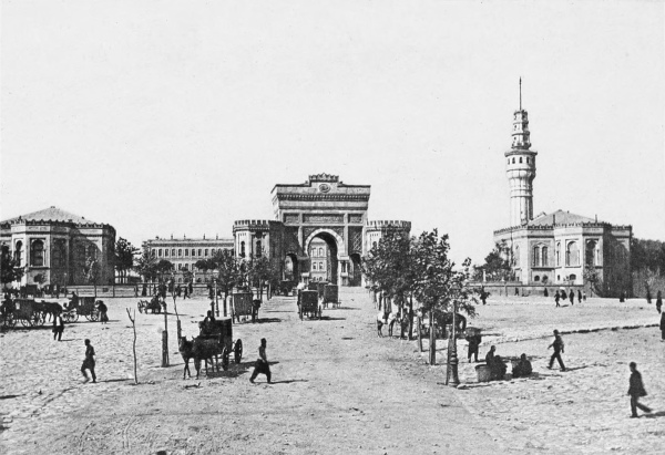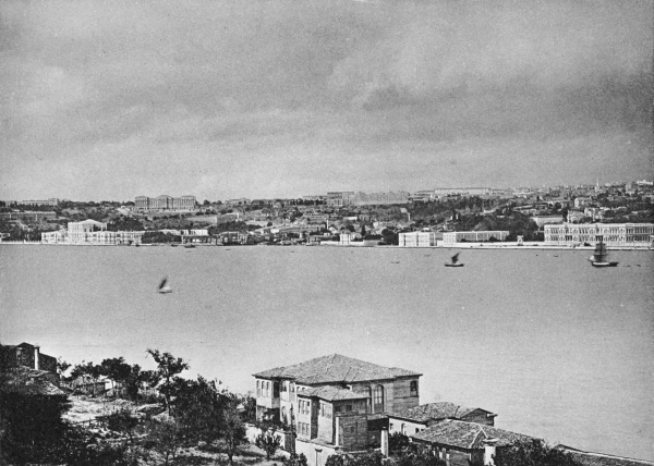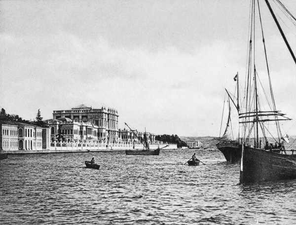 We saw him one day on his way to the mosque of Abdul-Mejid, which stands on the European shore of the Bosphorus not far from the imperial palace of Dolmabâghcheh. To reach this palace from Galata you pass through the populous district of Top-Khâneh, between a great gun-foundry and an immense arsenal, and, traversing the entire Mussulman quarter of Fundukli, which occupies the site of the ancient Aianteion, come out upon a spacious open square on the water’s edge, beyond which and on the shore of the Bosphorus rises the famous residence of the sultans.