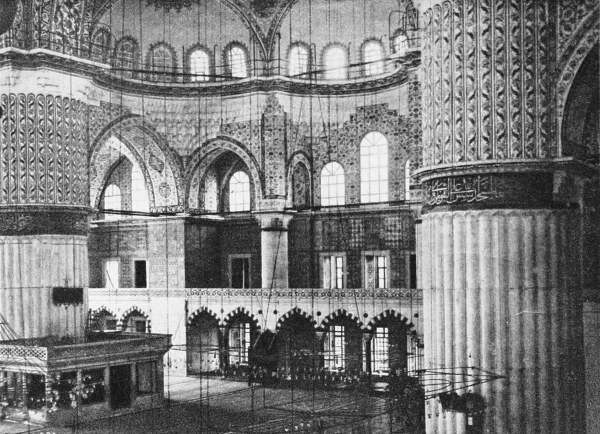 Such is the basilica. The mosque is, so to speak, spread over its surface and hung upon its walls.259 The mihrab—that is, the niche which indicates the direction in which Mecca lies—is hollowed out of one of the pilasters of the apse; to the right of it, high up on the wall, hangs one of the four prayer-carpets of the Prophet. In the angle of the apse nearest to the mihrab, reached by a steep little flight of stairs whose marble balustrade is carved with the most marvellous delicacy of workmanship, is the pulpit, surmounted by a queer conical roof and hung on either side with victorious banners of Muhammad II. Here the rhatib ascends to read the Koran,H and carries in his hand a drawn simeter, to signify that St. Sophia is a mosque acquired by the force of arms. Opposite the pulpit is the Sultan’s tribune enclosed within a gilded grating. Other pulpits or species of balconies, having railings of open-work carving, and supported on small marble columns and arabesqued arches, protrude here and there along the walls or toward the centre of the nave. On either side of the entrance stand two huge alabaster jars, found among the ruins of Pergamum and brought to Constantinople by Murad III. Enormous green disks, bearing inscriptions from the KoranI in letters of gold, are hung below the pendentives,260 beneath which great mural slabs of porphyry bear the names of Allah, Mohammed, and the first four khalifs. In the pendentives may still be seen the gigantic wings of the four mosaic seraphim, whose faces are now concealed beneath golden roses. From the roofs of the domes hang innumerable silken cords, measuring almost the entire height of the building, from which are suspended ostrich eggs, lamps of wrought bronze, and crystal globes. Here and there stand cassia-wood reading-desks, inlaid with copper and mother-of-pearl, on which lie manuscript copies of the Koran. On the pavement are spread great numbers of rugs and mats. The walls are bare, whitish, yellowish, gray, still adorned in some places with discolored mosaics. The general aspect is inexpressibly mournful.