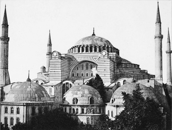 Looking across from the fountain, St. Sophia can be seen occupying one side of the intervening square. About the exterior there is nothing especially noteworthy. The only points which attract the eye are the lofty white minarets, which rise at the four corners from pedestals each the size of a house. The celebrated dome looks small, and it seems impossible that this can be the same as that which we are wont to see, from the Bosphorus and Sea of Marmora and the hillsides of Asia, rearing its mighty form like the head of some Titan against the blue heavens. It is a flattened dome overlaid with lead, flanked by two semi-domes, and pierced at the base by a row of small windows. The four walls which support it are painted in broad bands of white and red and strengthened by enormous masses of masonry. A number of mean-looking buildings, baths, schools, hospitals, mausoleums, and soup-kitchens, crowd around the base and effectually conceal the ancient architectural form of the basilica. Nothing can be seen but a heavy, irregular edifice, faded and bare as a fortress, and apparently totally inadequate to embrace the mighty expanse of St. Sophia’s great nave. Of the original basilica only the dome is visible, and even that has been despoiled of the silver splendor which, according255 to the Greeks, could once be seen from the summit of the Olympus. All the rest is Mussulman: one minaret was erected by Muhammad the Conqueror, another by Selim II., the two others by the Third Murad, the same who toward the close of the sixteenth century added the buttresses to strengthen the walls shaken by an earthquake, and placed the huge bronze crescent on the summit of the dome, the gilding alone of which cost fifty thousand ducats. The ancient atrium has disappeared, and the baptistry has been converted into a mausoleum where are interred the remains of Mustafa I. and Ibrahim, while nearly every one of the other small buildings which adjoined the Greek church have been either destroyed outright or else, by the erection of new walls or some other alteration, changed past recognition: on all sides the mosque crowds, pushes, and bears down upon the church, of which the head alone remains free, and even around that the imperial minarets mount guard like four gigantic sentinels. On the east side there is a doorway flanked by six marble and porphyry columns; another on the south leads into a courtyard surrounded by low, irregular buildings, in the midst of which a fountain for ablutions plays beneath a little arched canopy supported on eight, small columns. Viewed from the outside, there is nothing to distinguish St. Sophia from the other great mosques of Stambul, except that it is heavier and dingier; far less would it ever256 enter one’s head to name it “the greatest temple on earth after St. Peter’s.”