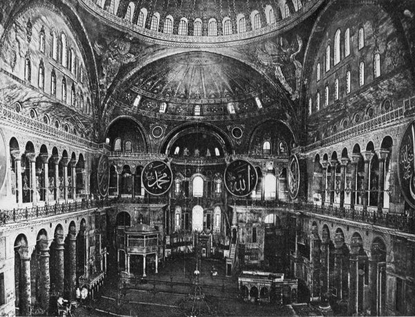 The plan of the edifice nearly approaches an equilateral rectangle, over the centre of which rises the great dome, supported on four mighty arches resting upon massive pilasters: these form, as it were, the skeleton of the entire building. From the arches on the right and left of the entrance there rise, before and beyond the great dome, two semi-domes, the three covering the entire nave, these semi-domes have six exedræ, of which the four on the sides are also covered with semi-domes, making258 four small circular temples enclosed in the large one. Between the two exedræ at the east end of the building is the apse, which projects beyond the external wall, and is likewise covered with a domed roof. Thus seven semi-domes encircle the main one, two just beyond it and five more beyond these, all of them without any apparent support, and presenting an extraordinary impression of lightness, as though they actually were, as a Greek poet once said, suspended by seven cords from the roof of the sky. All these domes are lighted by large windows arched and symmetrical. Between the four great pilasters, which form a square in the centre of the basilica, there rise to the right and left of the entrance eight wonderful columns of green marble, from which spring graceful arches richly carved with foliage, forming charming porticos on either side of the nave, and supporting at a great height two vast galleries, where are to be seen two other lines of columns and sculptured arches. A third gallery, communicating with the first two, runs above the narthex, and opens out on the nave by means of three enormous arches supported on double columns. Other smaller galleries, resting upon porphyry columns, intersect the four small temples at the extremities of the nave, and from them rise other columns supporting tribunes.