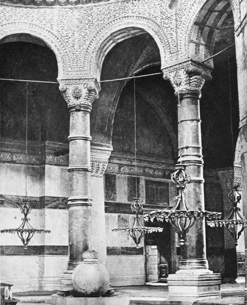 After making the circuit of the mosque several times in silence, we gave our guides permission to talk. They commenced by showing us the chapels built beneath the galleries, now, like the rest of the basilica, despoiled of everything of value: some of them, like the opistodomo of the Parthenon, serve as treasuries, where Turks who are about to start on long journeys deposit their money and other valuables to be secure from robbery, sometimes leaving their possessions there, under the protection of Allah, for years at a time; others have been closed up and are used either as infirmaries for the sick, where they lie awaiting death or recovery, or else places of confinement for the insane, whose melancholy cries or bursts of wild laughter271 awaken from time to time the echoes of the vast building.